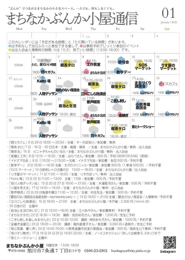 ・「旭川人物デッサン会」 13日20日27日19:00~21:00/主催:水溜星河さん/参加費:500円/予約不要